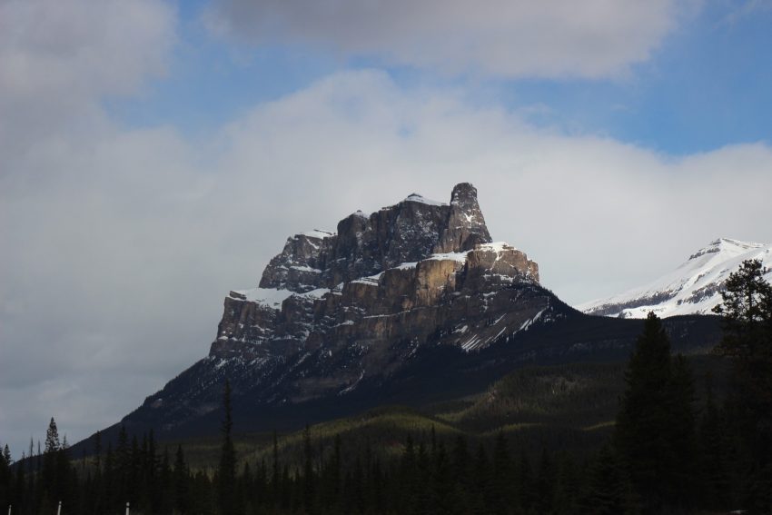 Driving between Banff and Lake Louise with view on Castle Mountain.